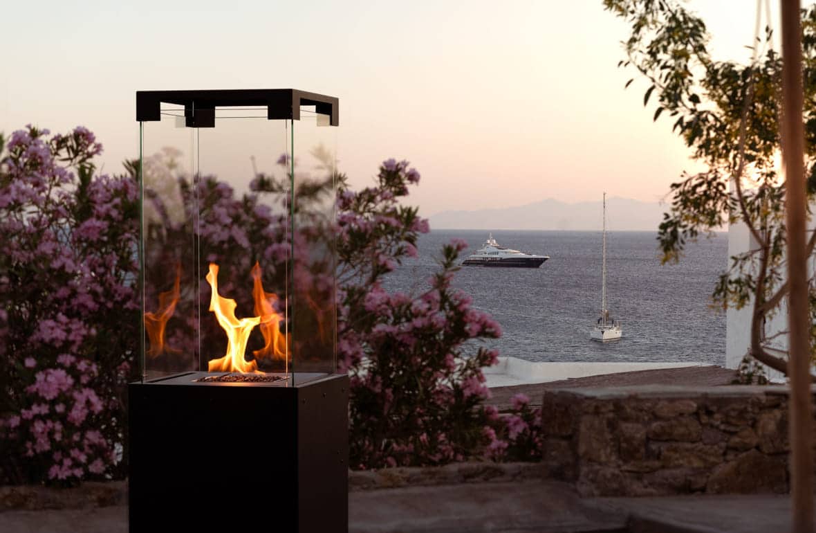 Außenfeuerstelle aus Glas vor Meer im Sonnenuntergang mit romantischer Stimmung