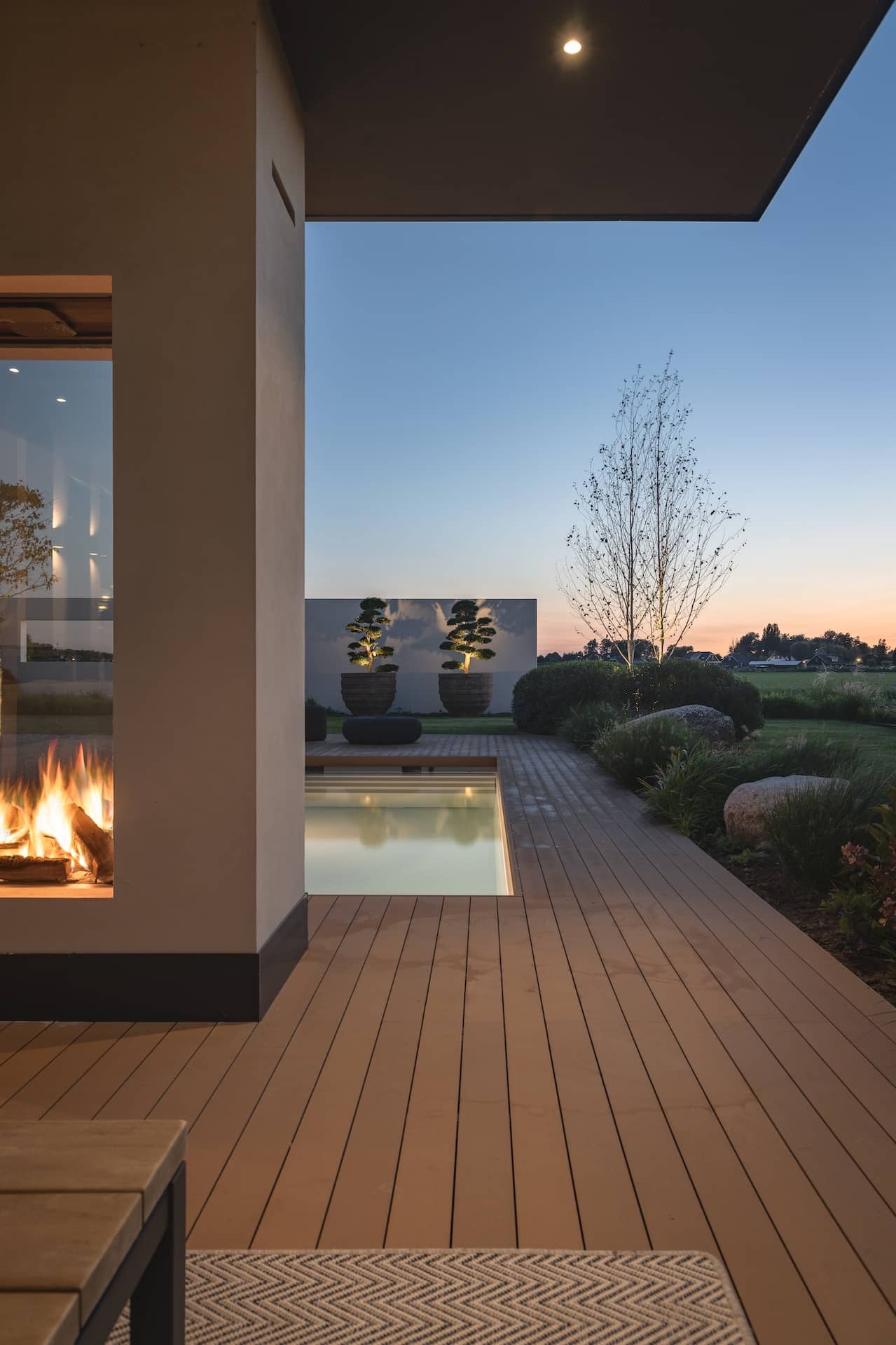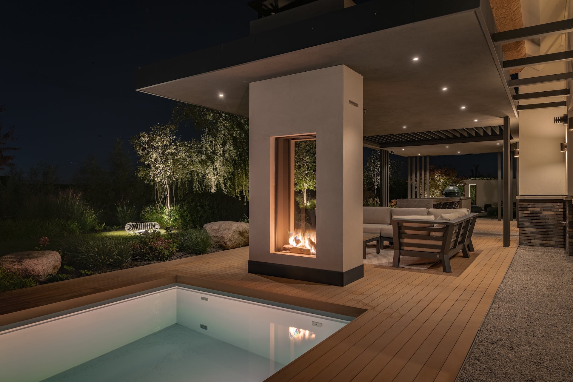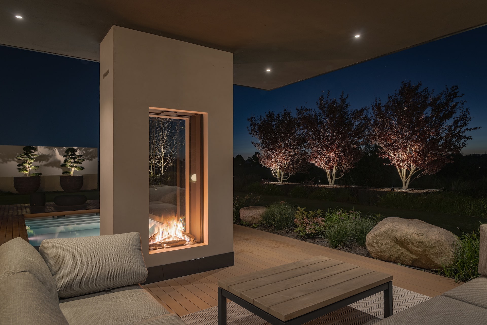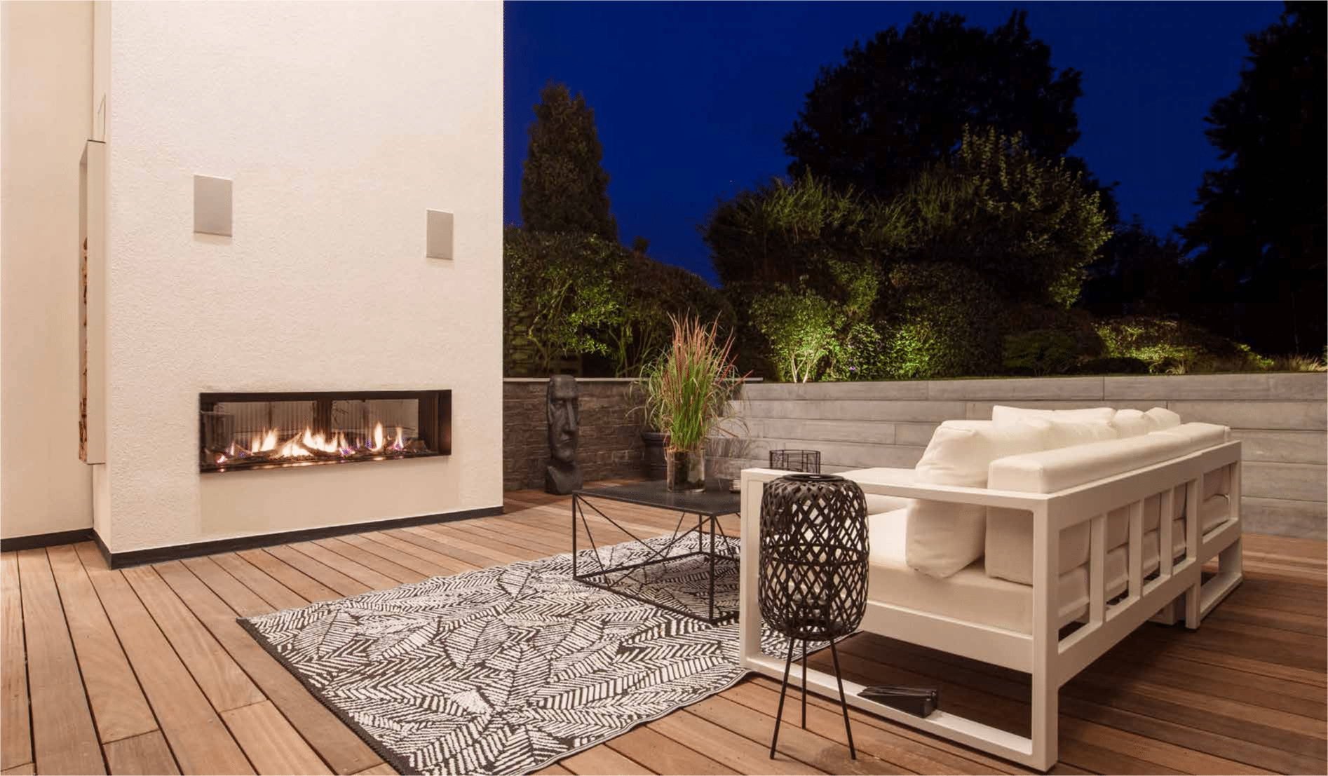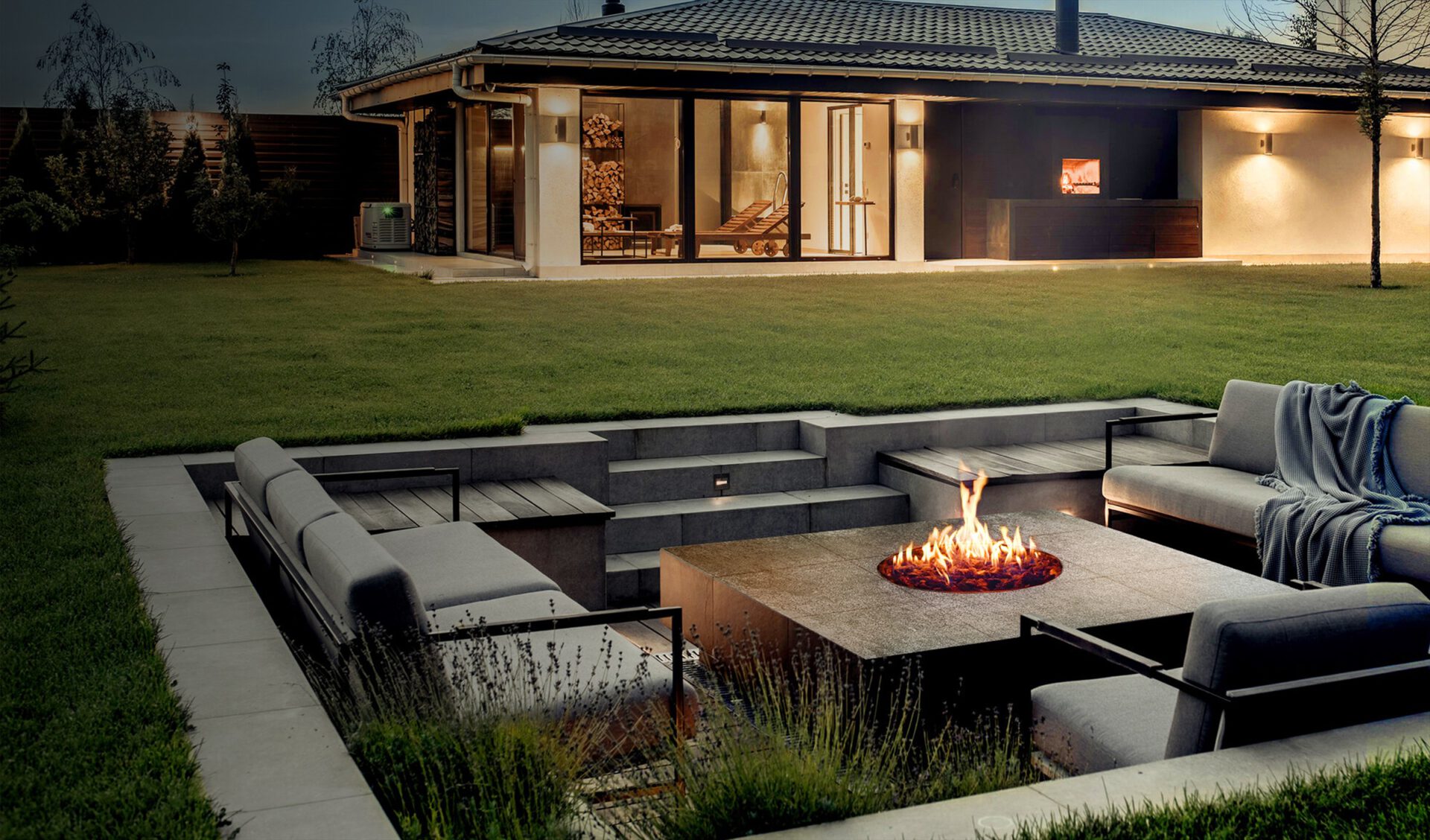 Outdoor Wohnzimmer mit moderner Feuerstelle, stilvollen Loungemöbeln und stimmungsvoller Beleuchtung bei Sonnenuntergang
