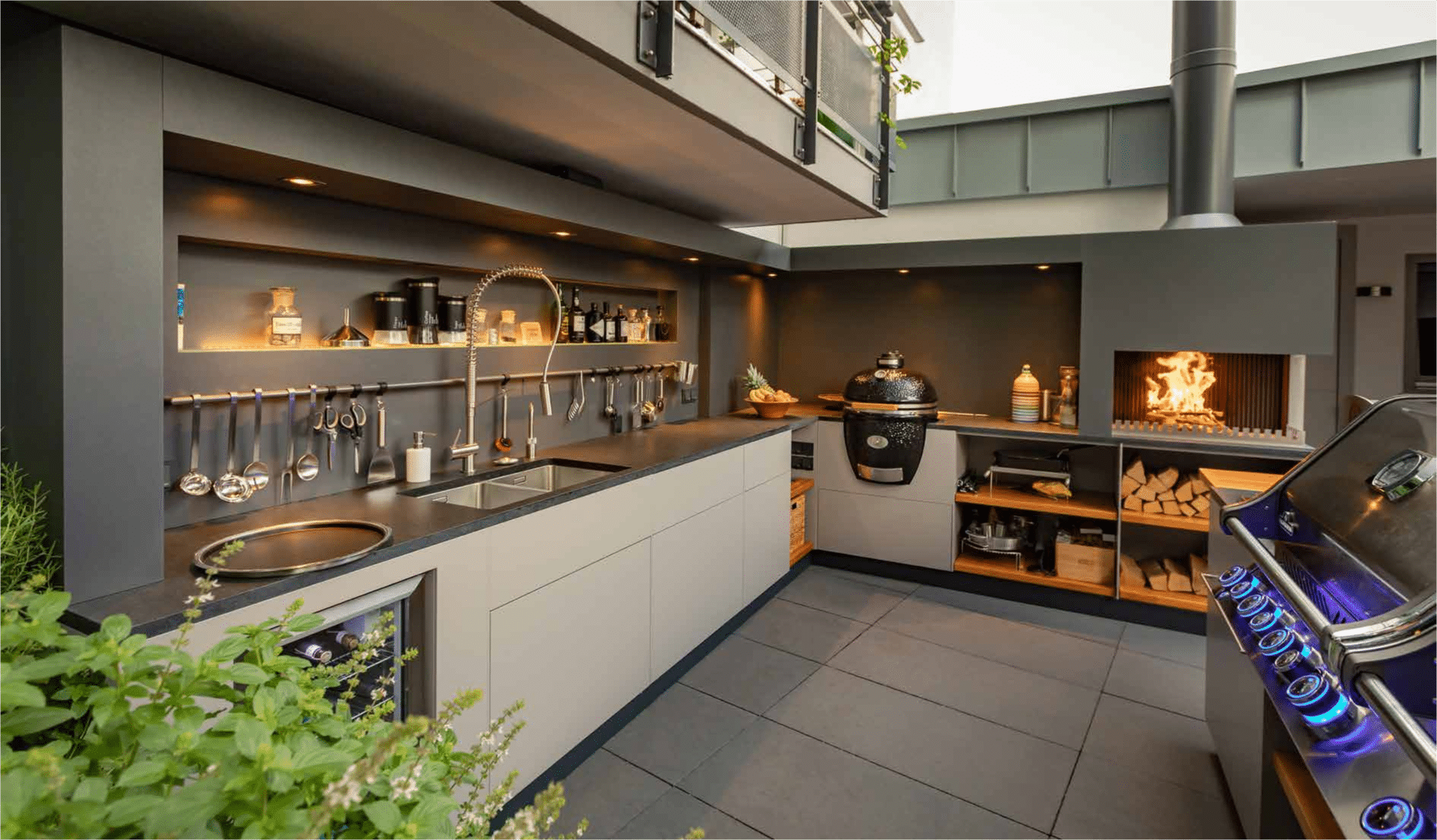 Freiluftmanufaktur Kaminlösung von Art of Fire auf moderner Terrasse